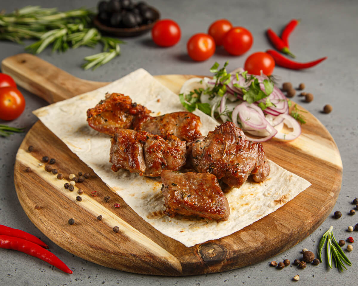 Шашлык из отборной баранины приготовленный в лучших кавказских традициях. Подается на лаваше с миксом лука и зелени.