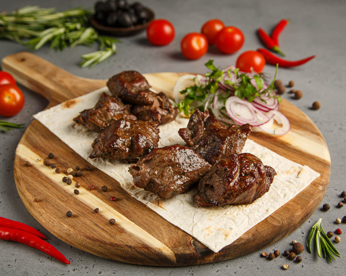 Шашлык из нежной и сочной говядины приправленный натуральными специями. Подается на лаваше с миксом лука и зелени.