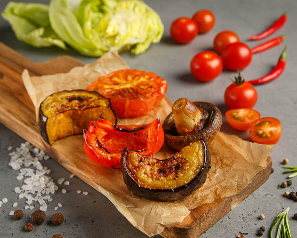 Приготовленные на огне томаты, баклажаны, болгарский перец и шампиньоны.