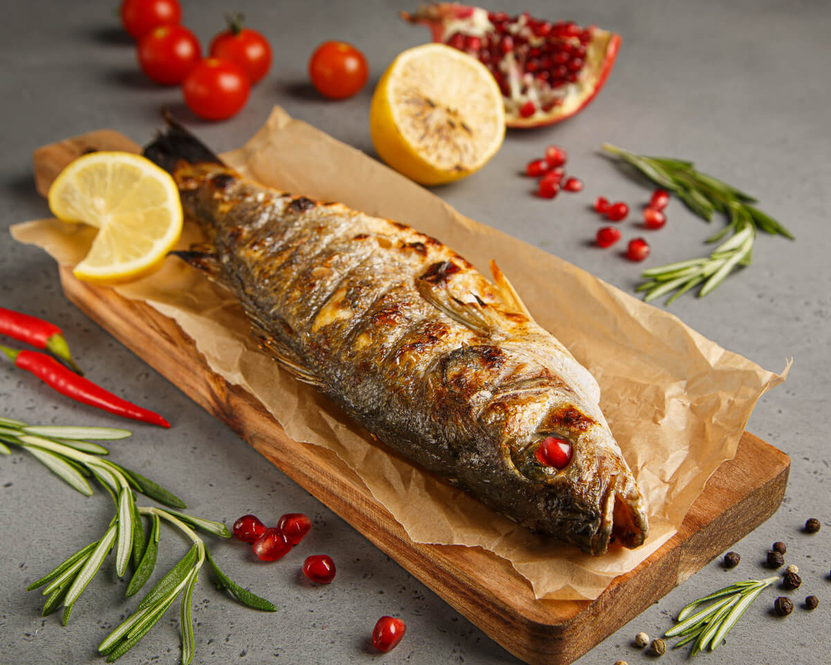 Сибас на мангале приправленный натуральными специями.
